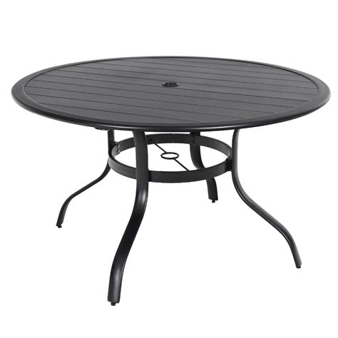A black round patio table is a type of outdoor furniture that is designed for use on a patio, deck, or other outdoor living space. It typically features a circular tabletop, which can range in size from small bistro tables to larger dining tables. The table is supported by a sturdy base, which is often made of metal or resin to provide durability and stability.